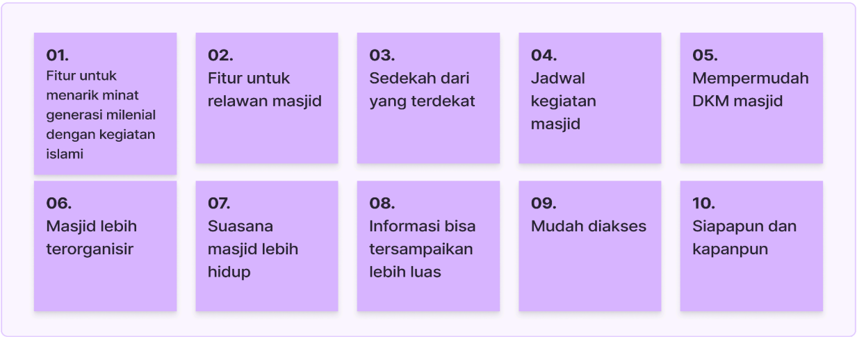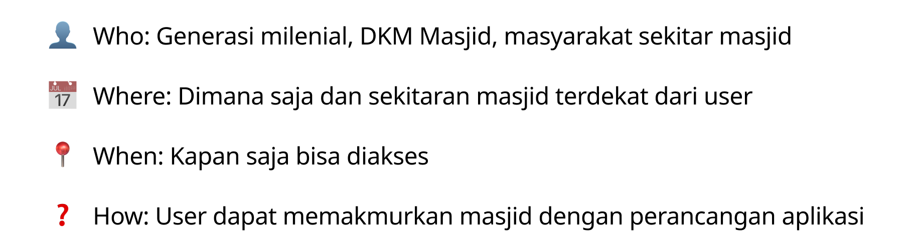 • Menentukan target pengguna (generasi milenial, DKM, masyarakat sekitar masjid) dan lokasi (masjid terdekat).