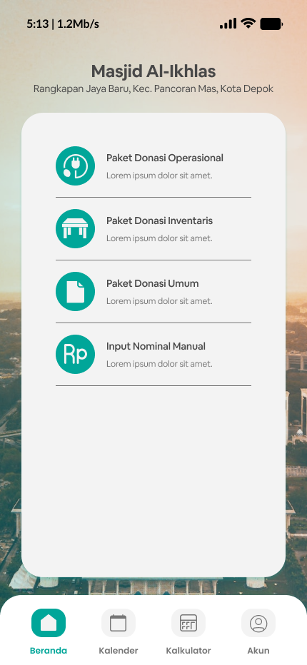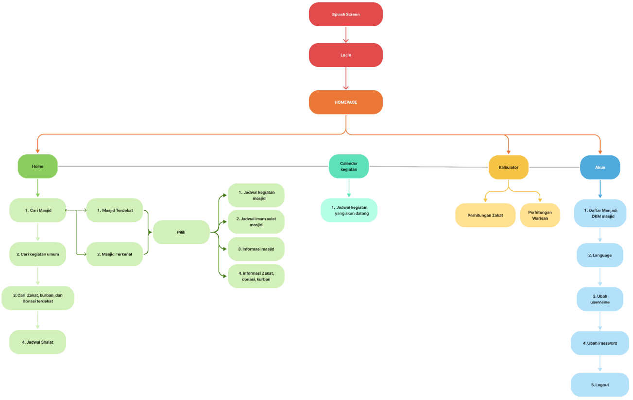• Uji coba pada pengguna menunjukkan bahwa aplikasi memudahkan akses informasi kegiatan masjid. Namun, beberapa pengguna mengusulkan penyederhanaan antarmuka untuk fitur tertentu, seperti kalkulator zakat.