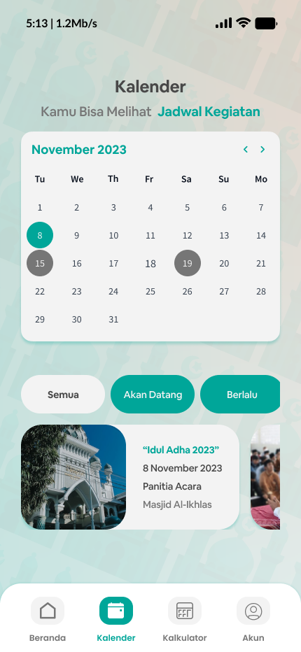 • Menampilkan jadwal kegiatan masjid dan pengingat aktivitas pengguna.