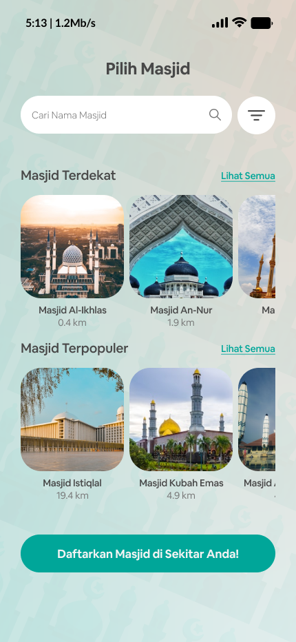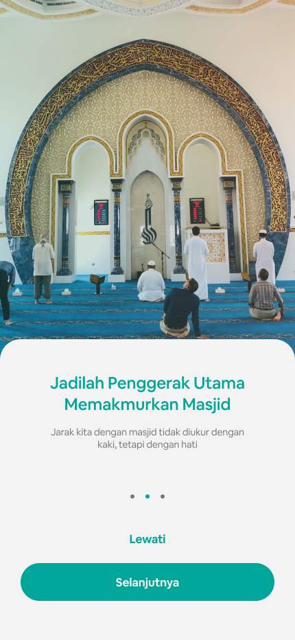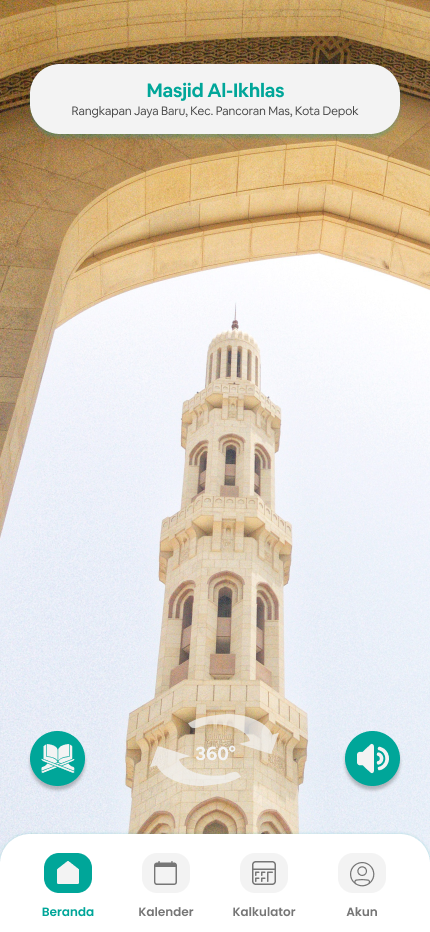 • Menyediakan fitur cari masjid, jadwal sholat, donasi, zakat, relawan, kontak DKM, dan tampilan interior dan eksterior masjid 360°.